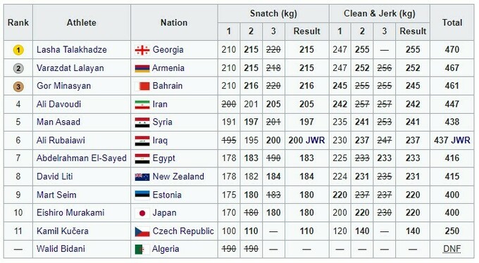 - 1. 🥇 Лаша Талахадзе (Грузия) – 470 кг (215 + 255)