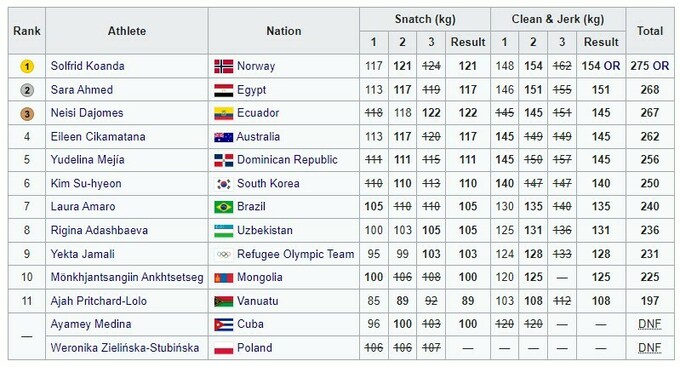 Сольфрид Коанда из Норвегии выиграла золото в весовой категории до 81 кг с олимпийскими рекордами в толчке (154 кг) и двоеборье (275 кг).