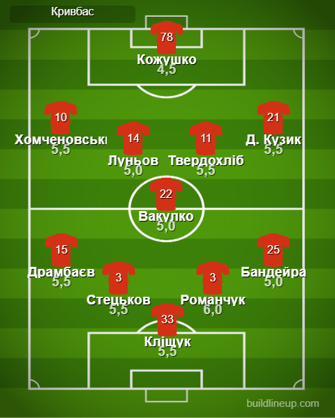 «Кривбасс»: Клищук – Бандейра (По, 61), Романчук, Стецьков, Драмбаев – Вакулко (Бизимана, 46) – Д. Кузык, Твердохлеб (Аморозо, 38), Лунев (Микитишин, 46), Хомченовский (Соса, 72) – Кожушко (Аду, 46)