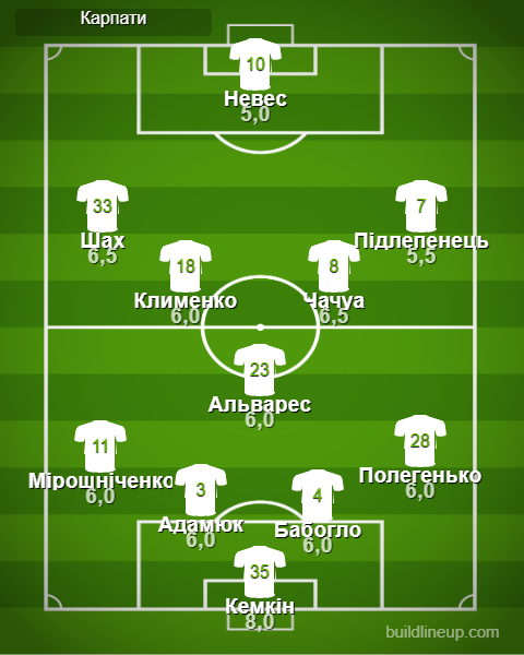 «Карпаты»: Кемкин – Полегенько, Бабогло, Адамюк, Мирошниченко – Альварес, Чачуа (Тлумак, 86), Клименко (Рябов, 46, Сакив, 90+3) – Подлепенец (Очеретько, 76), Невес (Стенио, 76), Шах (О. Кузык, 57)