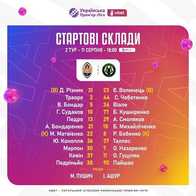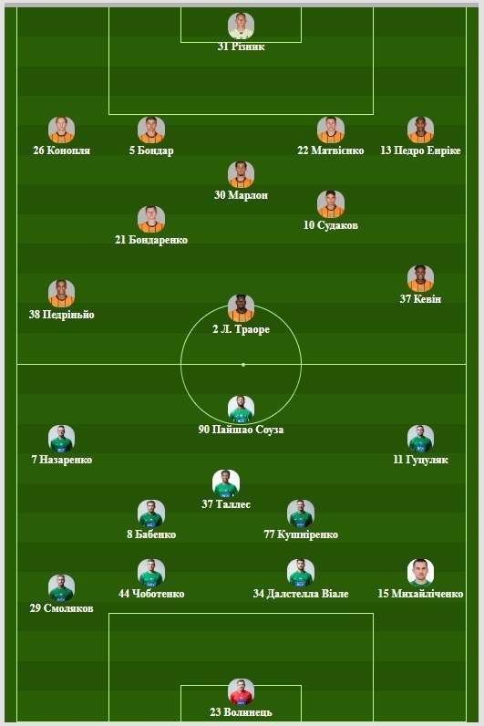 «Шахтер»: Ризнык, Педро Энрике, Матвиенко, Бондарь, Конопля, Марлон, Бондаренко, Судаков, Кевин, Педриньо, Траоре