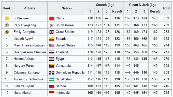 - 1. 🥇 Ли Вэньвэнь (Китай) – 309 кг (136 + 173)