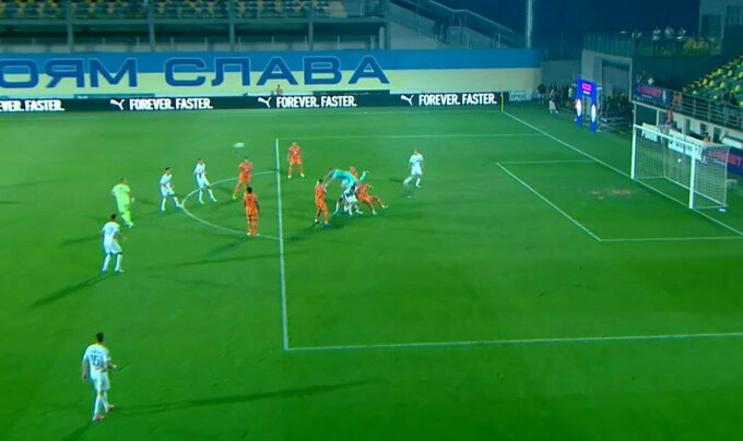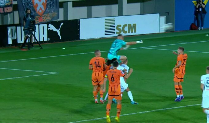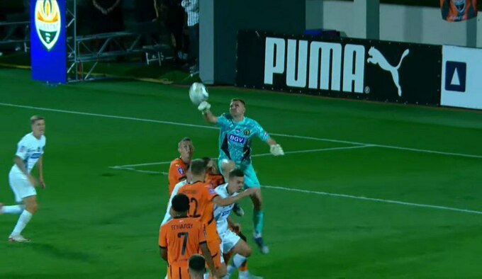 На 90+6-й минуте после подачи в штрафную площадь Полесья голкипер Евгений Волынец сыграл на выходе и коленом ударил по голове Марьяна Шведа.