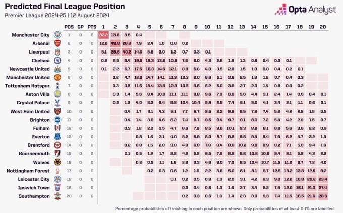 Статистический портал Opta проанализировал шансы клубов АПЛ на победу в сезоне 2024/25. Суперкомпьютер Opta, работающий на основе искусственного интеллекта, смоделировал следующий сезон Премьер-лиги 10 000 раз.