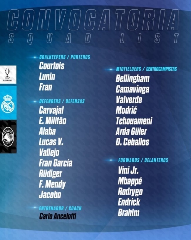В среду, 14 августа, состоится матч за Суперкубок УЕФА между мадридским «Реалом» и итальянской «Аталантой» из Бергамо.