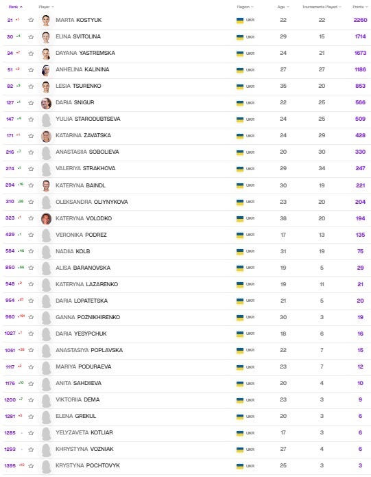 Марта Костюк после удачного выступления Дианы Шнайдер покинула первую двадцатку. Элина Свитолина добавила четыре позиции и снова в топ-30. Даяна Ястремская опустилась на 34-ю строчку мирового рейтинга, она снова третья ракетка Украины. Из первой полусотни выпала Ангелина Калинина.