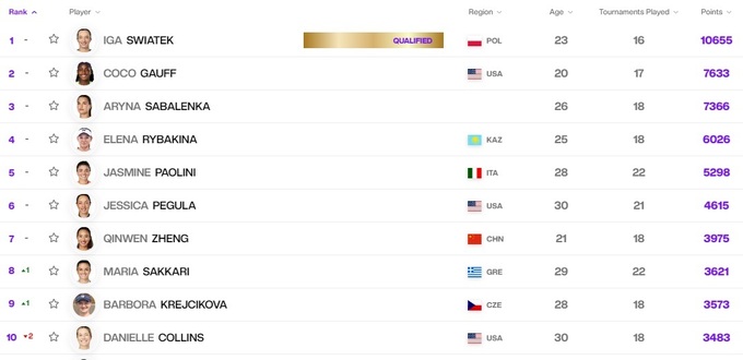 В первой десятке состоялось небольшое изменение: Даниэль Коллинс пропустила вперед Марию Саккари и Барбору Крейчикову.