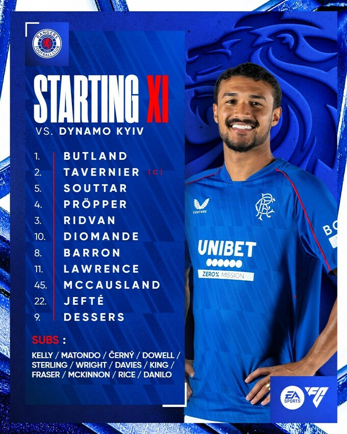 Рейнджерс: Батленд, Тавернье, Суттар, Проппер, Ридван, Диоманде, Баррон, Лоуренс, Маккосленд, Жефте, Дессерс.