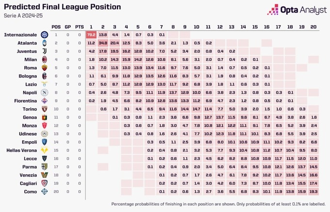 Статистический портал Opta проанализировал шансы клубов Серии A на победу в сезоне 2024/25. Суперкомпьютер Opta, работающий на основе искусственного интеллекта, смоделировал следующий сезон чемпионата Италии 10 000 раз.