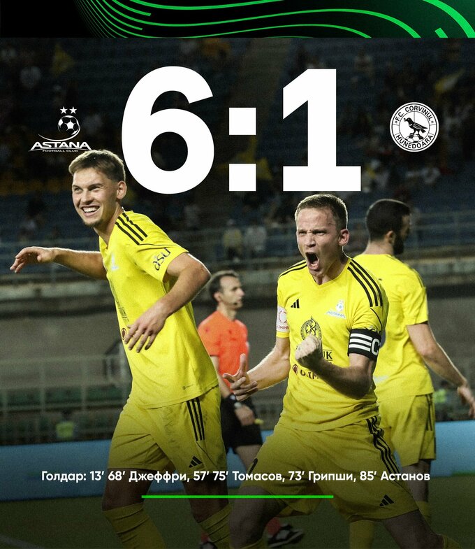 Астана из Казахстана дома устроила разгром румынскому клубу Корвинул (6:1) после выездной победы в первой игре (2:1).