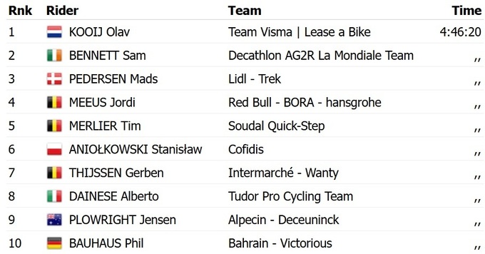 Нидерландский велогонщик команды «Visma Lease a Bike» Олав Коой стал победителем четвертого этапа многодневки Тур Польши. В финишном спринте из пелотона он опередил ирландца Сэма Беннетта из «Decathlon Ag2r» и датчанина Мадса Педерсена из «Lidl Trek».