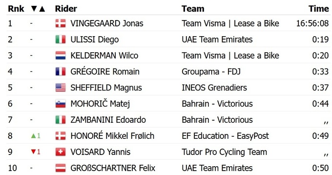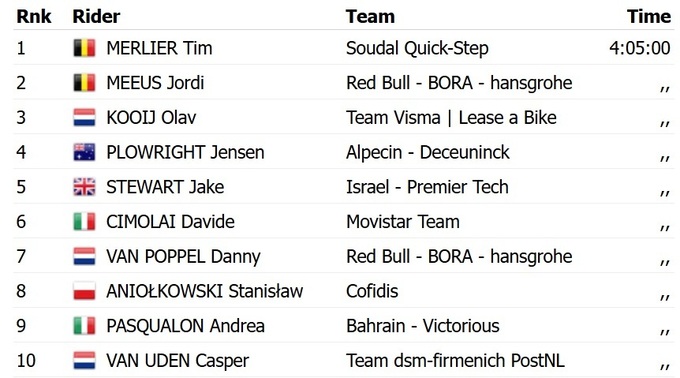 В финишном спринте из пелотона он опередил своего соотечественника, Йорди Меуса из «Red Bull Bora». Топ-3 замкнул победитель вчерашнего четвертого этапа, нидерландец Олав Коой из «Visma Lease a Bike».