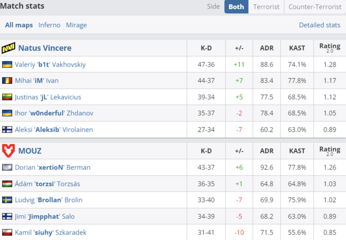 Первым был выбор MOUZ – Inferno. NaVi очень хорошо начали игру и заработали 8-кратное преимущество в моменте. После счета 8:1 команда отдала 2 неприятных раунда, однако закрыла оппонента со счетом 9:3 в первой половине. Вторую часть карты «рожденные побеждать» начали со взятого пистолетного раунда. Казалось бы, все идет к легкой победе, но на пути встал ответный форс, который NaVi проиграли и в конечном итоге со счета 10:3 довели карту до овертаймов (12:12). В дополнительное время украинская команда закрыла своего оппонента со счетом 16:14.