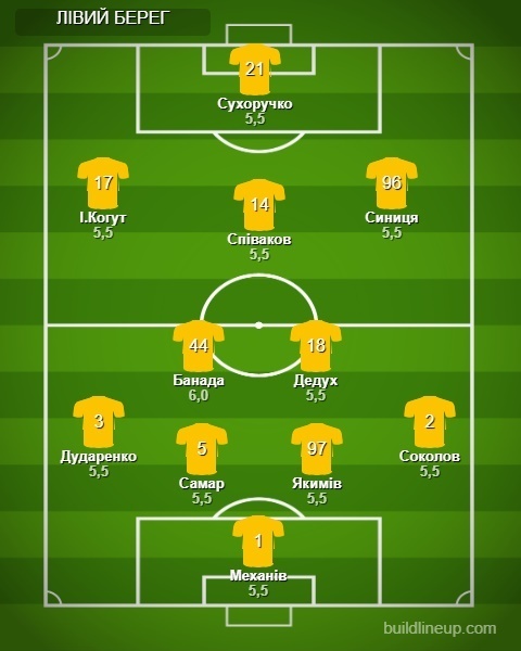 Левый Берег: Механив, Дударенко (Косовский, 90), Самар, Якимов, Соколов, Банада, Дедух (Сидней, 90), И.Когут (Галас, 72), Синица, Спиваков (Литовченко, 72), Сухоручко.