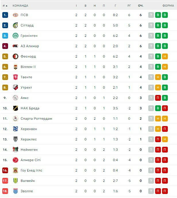 После двух туров лидируют ПСВ, Фортуна Ситтард, Гронингем и АЗ Алкмаар (по 6 очков из 6).