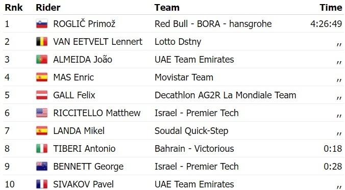 Этот успех позволил Рогличу перехватить красную майку лидера общего зачета. Вчера третий этап выиграл Воут Ван Арт.