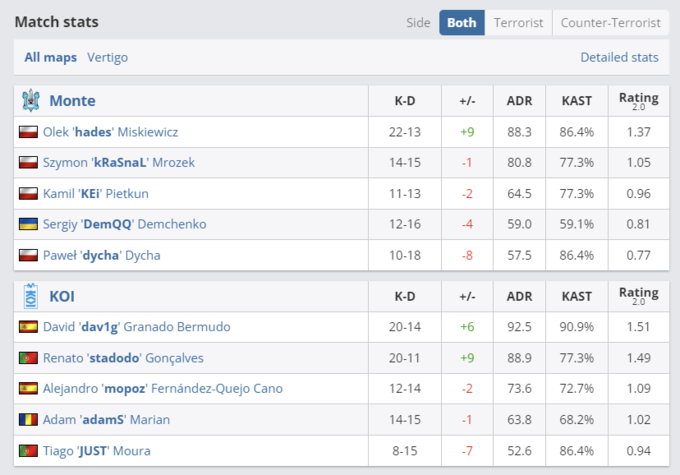 Для игры команды остановились на выборе карты Vertigo. Первая половина матча завершилась со счетом 4:8 в пользу KOI. Во начале второй части украинская команда пыталась совершить камбек, однако взяла лишь 5 раундов и проиграла карту со счетом 9:13.