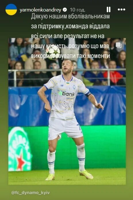 «Спасибо нашим болельщикам за поддержку, команда отдала все силы, но результат не в нашу пользу. Понимаю, что должен был использовать такие моменты», – написал Ярмоленко в социальных сетях.