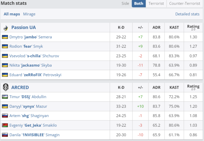 Для игры команды остановились на выборе карты Mirage. Первая половина матча завершилась со счетом 3:9 не в пользу украинской команды. Во второй части игры Passion также не могли прийти в себя и довели счет до 6:12. Однако именно в этот момент они начали своей камбек и довели матч до овертаймов, где обыграли противника со счетом 19:17