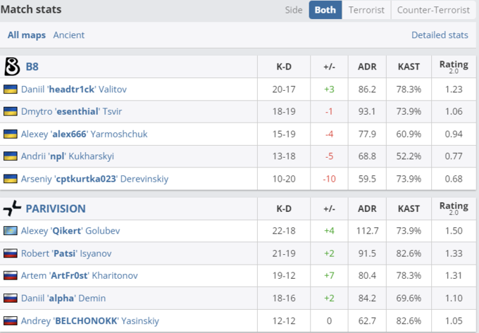 Для игры команды остановились на выборе карты Ancient. Первая половина матча завершилась со счетом 5:7 не в пользу украинской команды. Во второй части игры B8 сумели прийти в себя и довели счет до 10:9 в свою пользу. Однако 10-й раунд стал для них последним. Как итог, украинская команда проиграла со счетом 10:13.