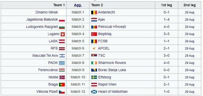 Также крупных побед добились Маккаби Тель-Авив и болгарский Лудогорец. Рижский клуб РФШ из Латвии дома неожиданно переиграл АПОЭЛ из Кипра (2:1).