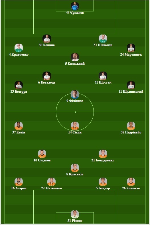 «Шахтер»: Ризнык, Азаров, Матвиенко, Бондарь, Конопля, Крыськив, Судаков, Бондаренко, Кевин, Педриньо, Сикан