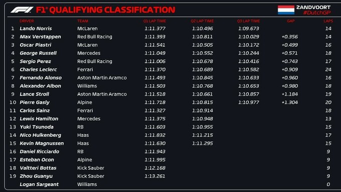 Состоялась квалификация в рамках Формулы-1 в Нидерландах. Поул завоевал пилот Макларена Ландо Норрис, который выдал невероятный последний круг, опередив местного любимца Макса Ферстаппена на 0,3 секунды.