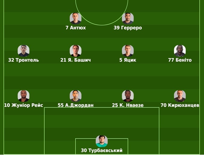 «Заря»: Турбаевский – Нваэзе, Джордан, Жуниор Рейс, Тронтель, Яцык, Башич, Бенито, Антюх, Кирюханцев, Герреро.