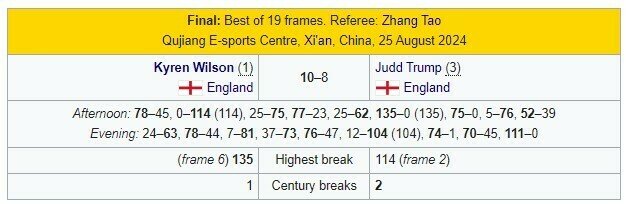Ранний подход Уилсона в 18-м фрейме принес ему всего 22 очка, но слабая защита Трампа снова позволила Кайрену оказаться у стола, и он добавил 89 очков, обеспечив себе победу (10:8).
