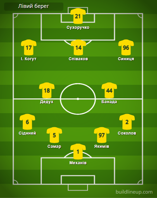 «Левый берег»: Механив – Сиднней (Шаповал, 46), Самар, Якимив, Соколов – Дедух, Банада – И. Когут (Н. Когут, 46), Спиваков (Галас, 65), Синица (Войцеховский, 85) – Сухоручко.