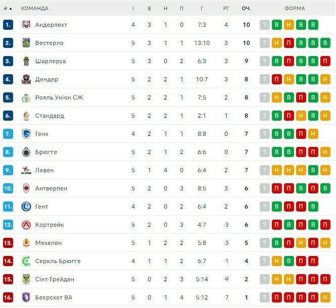 После 5 туров лидируют Андерлехт и Вестерло, за который выступает украинский хавбек Сергей Сидорчук.