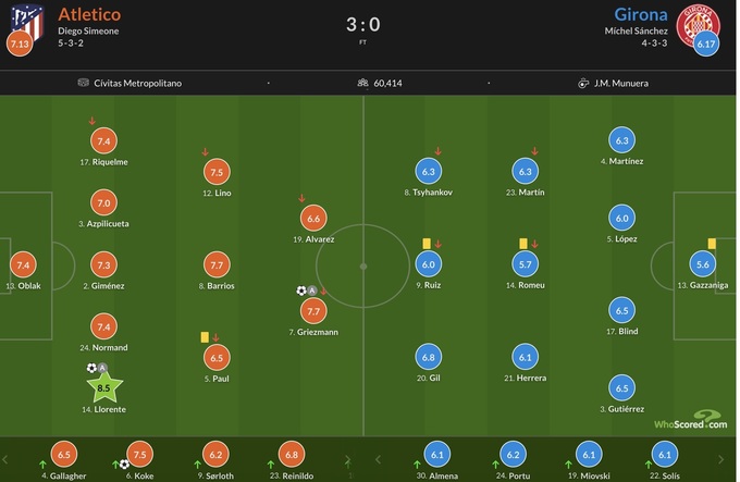 Героем поединка был признан игрок «Атлетико» Маркос Льоренте, который забил один гол и отдал одну результативную передачу и получил высокую оценку – 8.5 баллов.