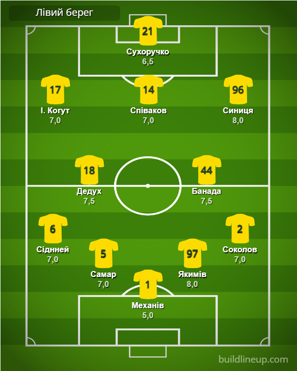 «Левый берег»: Механив – Сидней (Шаповал, 46), Самар, Якимив, Соколов – Дедух, Банада – И. Когут (Н. Когут, 46), Спиваков (Галас, 65), Синица (Войцеховский, 85) – Сухоручко.