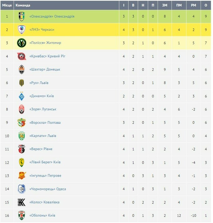 Вверху турнирной таблицы сложилось неожиданное двоевластие: две команды – Александрия и ЛНЗ – набрали по 9 очков. При этом команда Руслана Ротаня пока что не теряла очков в чемпионате. Далее идут Полесье и Кривбасс (по 7 пунктов).