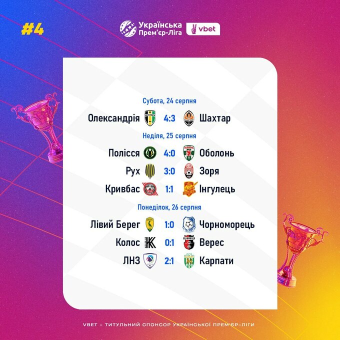 С 24 по 26 августа прошли матчи 4-го тура Украинской Премьер-лиги 2024/25.