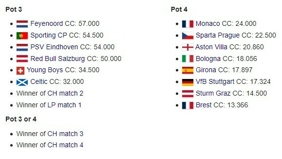 - Корзина 3. Фейеноорд (Нидерланды), Спортинг (Португалия), ПСВ (Нидерланды), РБ Зальцбург (Австрия), Янг Бойз (Швейцария), Селтик (Шотландия)