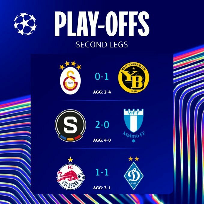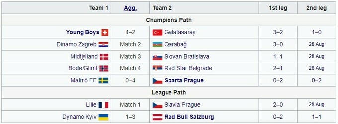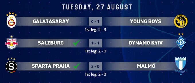 По итогам игрового дня в основной раунд Лиги чемпионов пробились РБ Зальцбург (Австрия), Янг Бойз (Швейцария), Спарта Прага (Чехия).