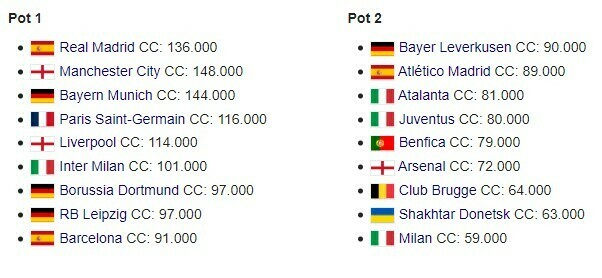- Корзина 1. Манчестер Сити (Англия), Бавария (Германия), Реал Мадрид (Испания), ПСЖ (Франция), Ливерпуль (Англия), Интер (Италия), Боруссия Дортмунд (Германия), РБ Лейпциг (Германия), Барселона (Испания)
