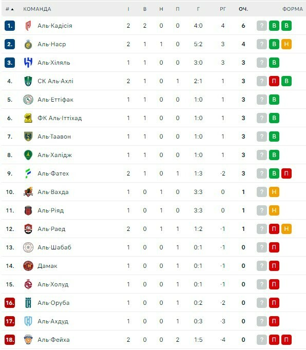 Аль-Наср тренирует Луиш-Каштру, экс-наставник Шахтера. Его команда идет на второй позиции, набрав 4 очка из 6. Лидирует клуб-новичок Аль-Кадисия (6 из 6).