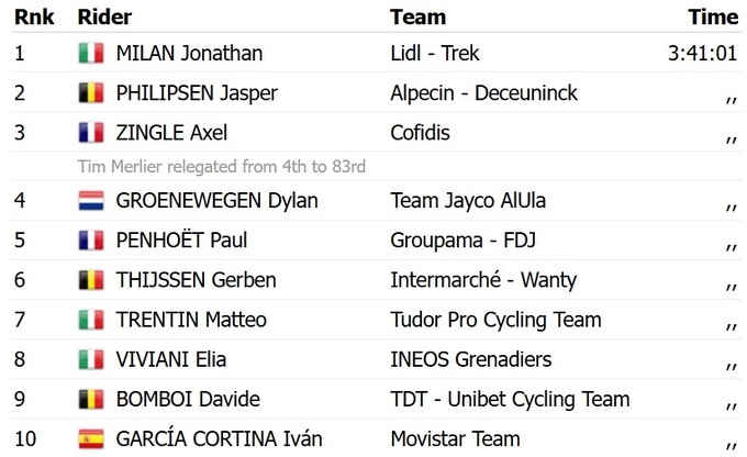 Четвертым финишировал бельгиец Тим Мерлир из «Soudal Quick Step», однако он спровоцировал завал на финише и был релегирован на последнее место в группе.