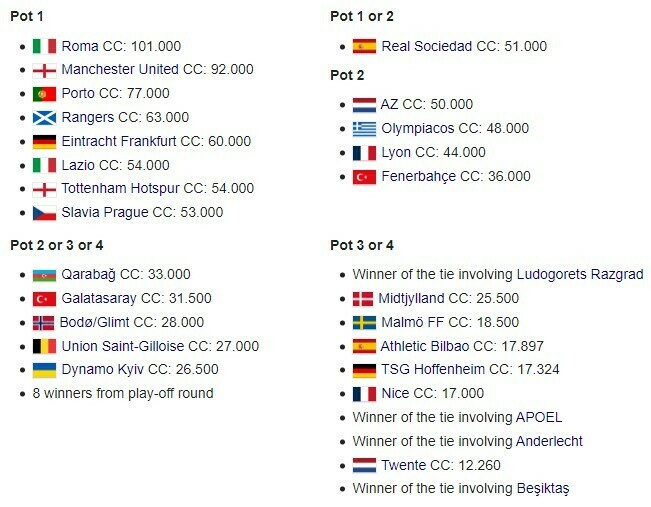 - Корзина 1: Рома (Италия), Манчестер Юнайтед (Англия), Порту (Португалия), Рейнджерс (Шотландия), Айнтрахт (Германия), Лацио (Италия), Тоттенхэм (Англия), Славия Прага (Чехия)