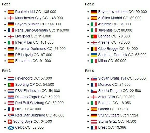 - Корзина 1. Манчестер Сити (Англия), Бавария (Германия), Реал Мадрид (Испания), ПСЖ (Франция), Ливерпуль (Англия), Интер (Италия), Боруссия Дортмунд (Германия), РБ Лейпциг (Германия), Барселона (Испания)