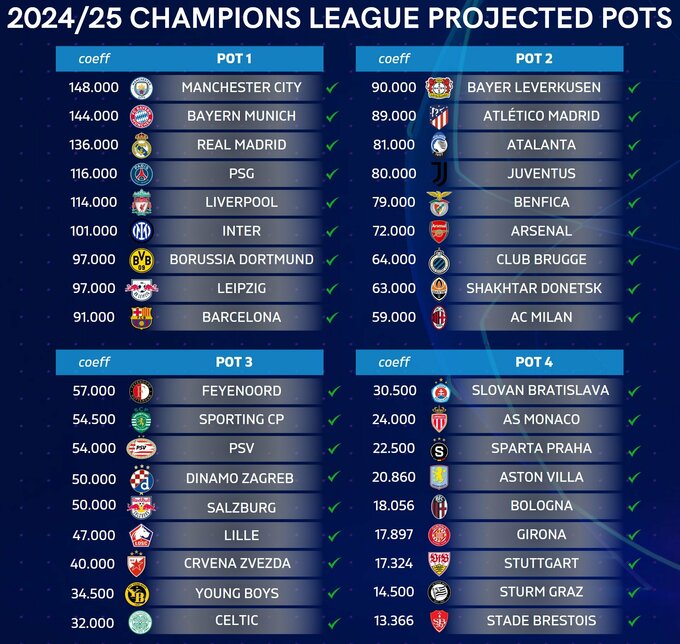 - Корзина 4. Слован Братислава (Словакия), Монако (Франция), Спарта Прага (Чехия), Астон Вилла (Англия), Болонья (Италия), Жирона (Испания), Штутгарт (Германия), Штурм (Австрия), Брест (Франция)