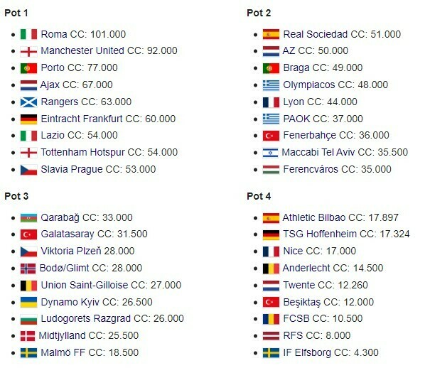 - Корзина 1: Рома (Италия), Манчестер Юнайтед (Англия), Порту (Португалия), Аякс (Нидерланды), Рейнджерс (Шотландия), Айнтрахт (Германия), Лацио (Италия), Тоттенхэм (Англия), Славия Прага (Чехия)