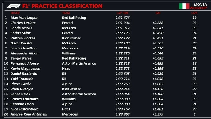 Лучшее время показал Макс Ферстаппен, топ-3 замкнули Шарль Леклер и Ландо Норрис.