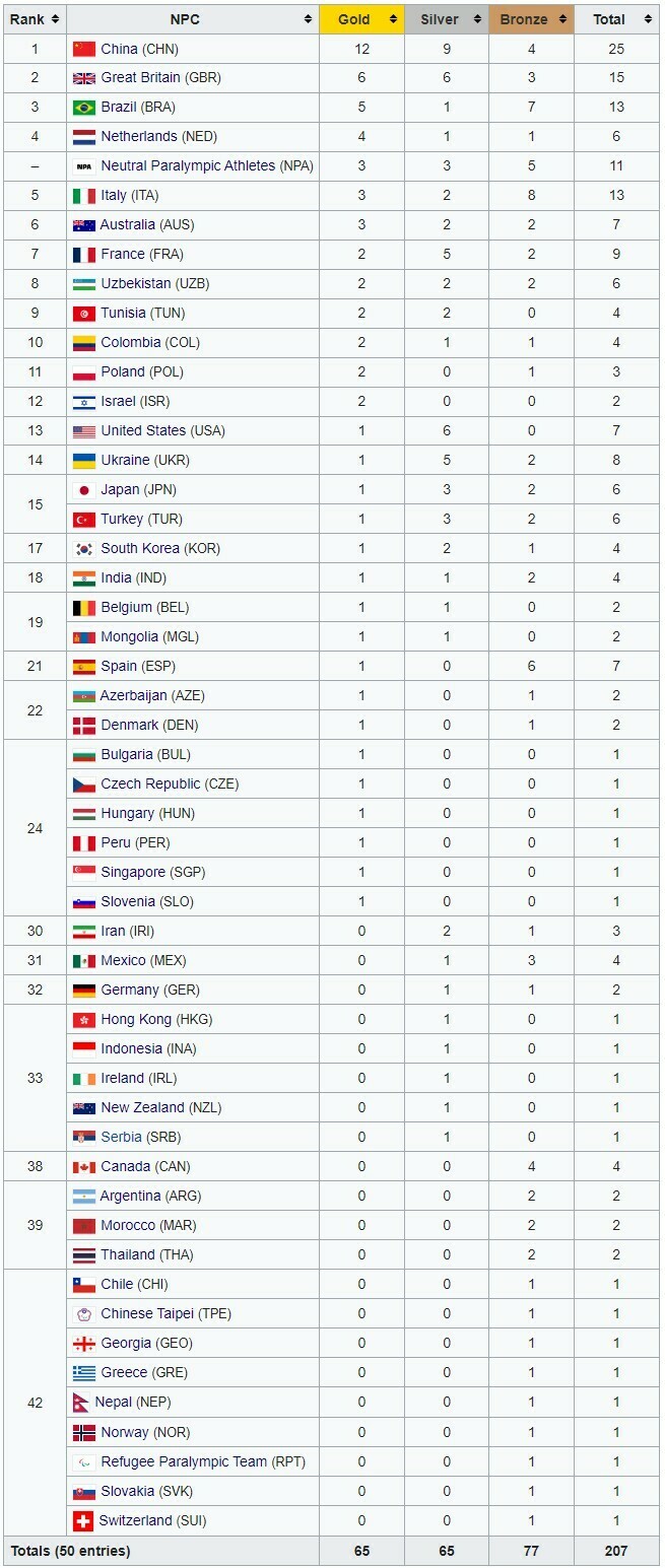В медальном зачете лидирует Китай (12–9–4), далее идут Великобритания (6–6–3), Бразилия (5–1–7), Нидерланды (4–1–1), Италия (3–2–8).