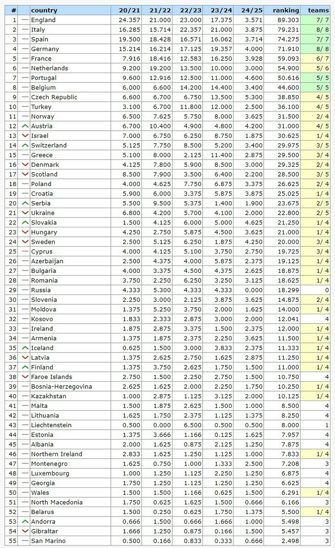 В рейтинге 2025 Украина понизилась до 21-й позиции (22.800). За неделю прибавка составила +0.100. У Украины в еврокубках остается 2 клуба из 5: Шахтер в ЛЧ и Динамо в ЛЕ. Три остальных клуба – Кривбасс, Полесье и обанкротившийся Днепр-1 – не принесли в копилку ни очка.