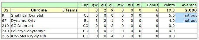 Таблица коэффициентов. Трое с нулем: у Украины – еще минус одна позиция