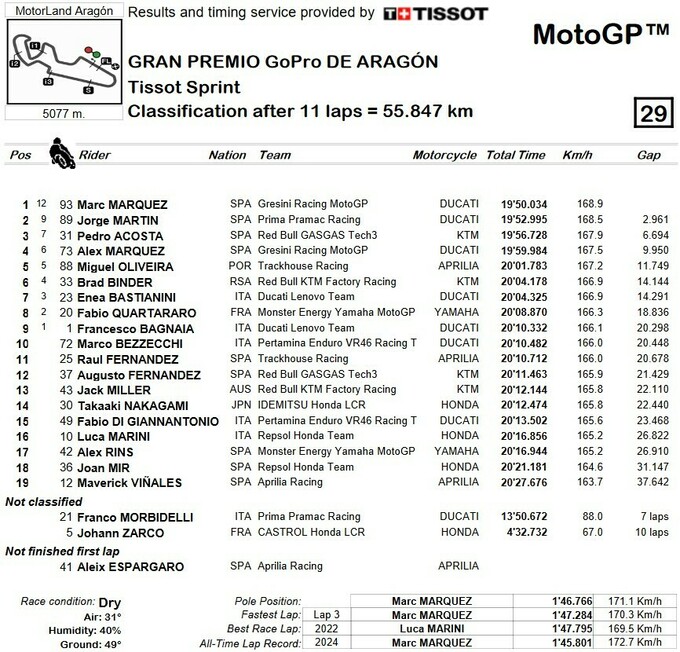 Вторым финишировал Хорхе Мартин из Pramac также на мотоцикле Дукати. Благодаря этом он вернул себе лидерство в зачете чемпионата мира сред райдеров. Замкнул первую тройку лидер Tech3 Педро Акоста на мотоцикле КТМ.