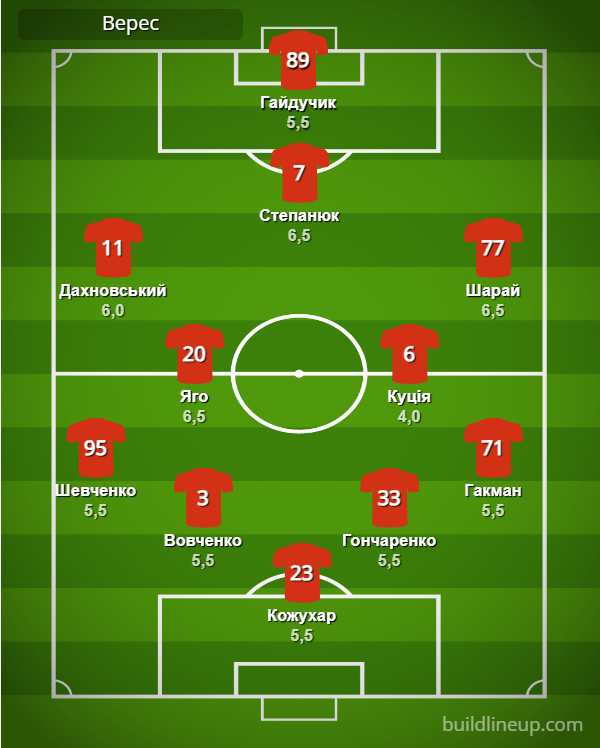 «Верес»: Кожухарь – Шевченко, Вовченко, Гончаренко, Гакман – Яго (Кучеров, 75), Куция (Клец, 46) – Дахновский (Смиян, 83), Степанюк, Шарай (Луан, 67) – Гайдучик (Мрвалевич, 76).